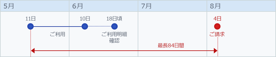 カードご利用からお支払日まで最大84日間のお支払猶予が支払いサイトと入金サイトの課題解決をサポート、社用資金の効率的な運用が可能となります。