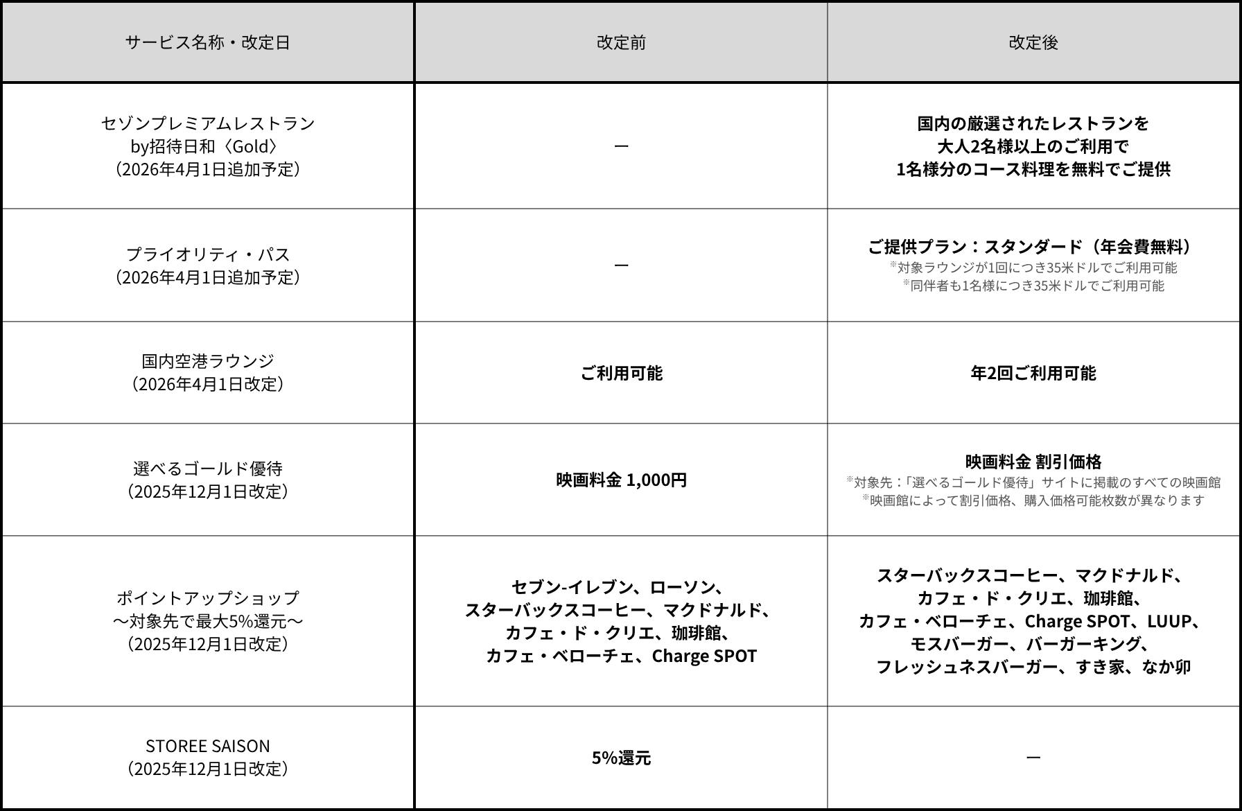 追加予定のサービス「セゾンプレミアムレストランby招待日和〈Gold〉」「プライオリティ・パス」につきましては、2026年4月1日(水)以降にご利用ガイドページにて詳しくご案内いたします。