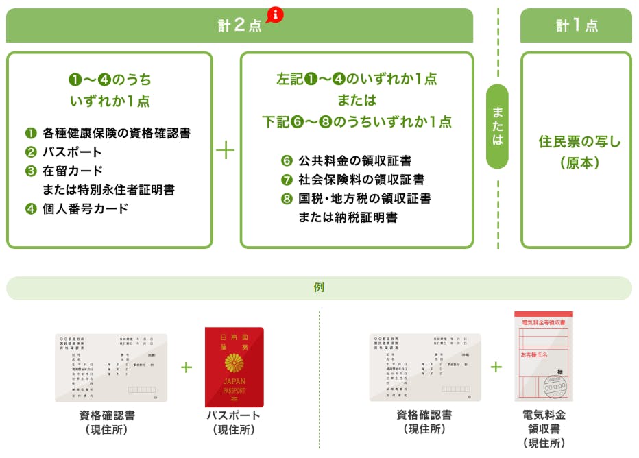 - 個人番号(マイナンバー)、各種健康保険の資格確認書に被保険者等記号・番号および保険者番号の記載がある場合は、黒塗りするなどして番号が見えないようにしたうえでご提出ください。