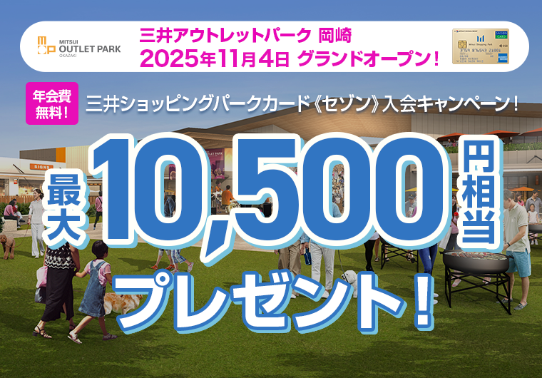 - ・三井アウトレットパーク 岡崎で、2026年3月31日(火)までにクレジット利用いただいた金額に対して、最大で特典金額まで1円単位でご請求時にキャッシュバックいたします。