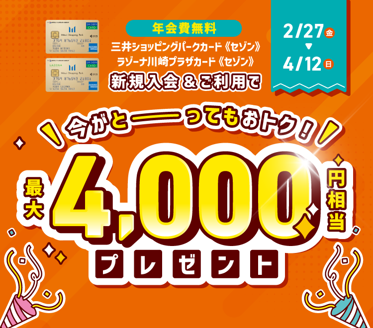 キャンペーン期間中、三井ショッピングパークカード《セゾン》、ラゾーナ川崎プラザカード《セゾン》に