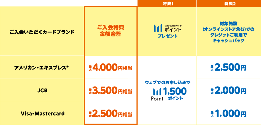 WEBよりご入会いただくと、お選びいただいたカードブランドに応じた入会特典をプレゼントいたします。