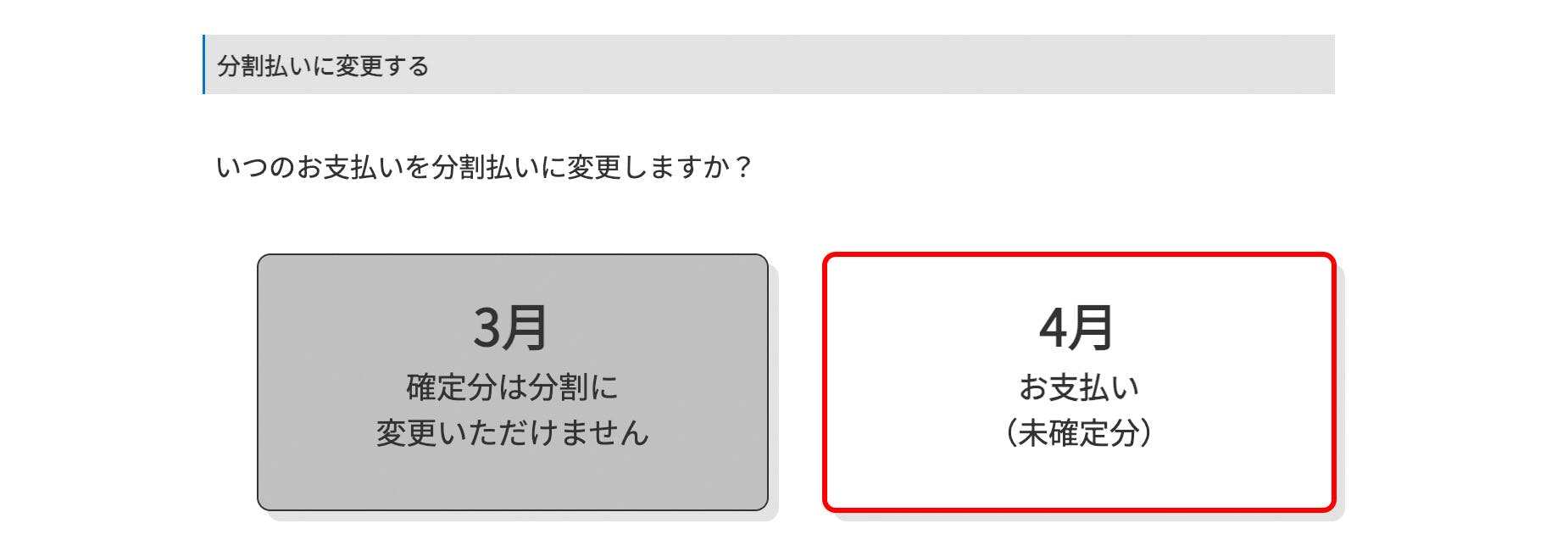 お支払い変更については、Netアンサーのお支払い変更手続きにて「分割払いに変更する」を選択し、ご変更ください。